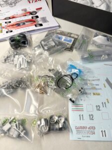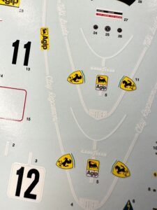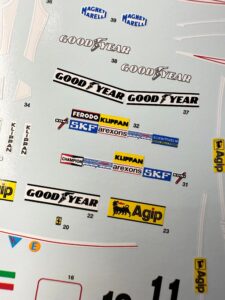 Passando alla recensione dettagliata del contenuto del kit, iniziamo con il foglio delle decalcomanie. La livrea iconica della 312T è stampata con un perfetto registro dei vari colori.