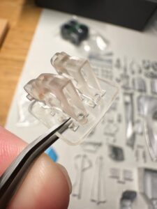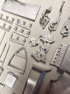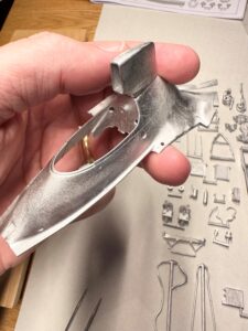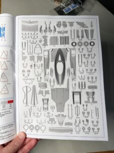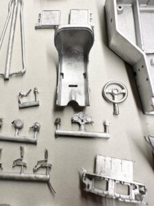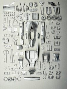 La gamma completa di componenti in metallo bianco fusi, con la monoscocca e la carrozzeria immediatamente riconoscibili, circondate da numerose parti più piccole e altamente dettagliate.