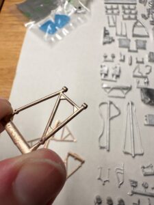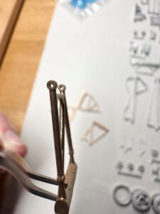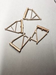 La sospensione posteriore in ottone vista lateralmente, che mostra i fori di fissaggio con “bulloni” in metallo tornito. Una soluzione perfetta per questi componenti complessi.